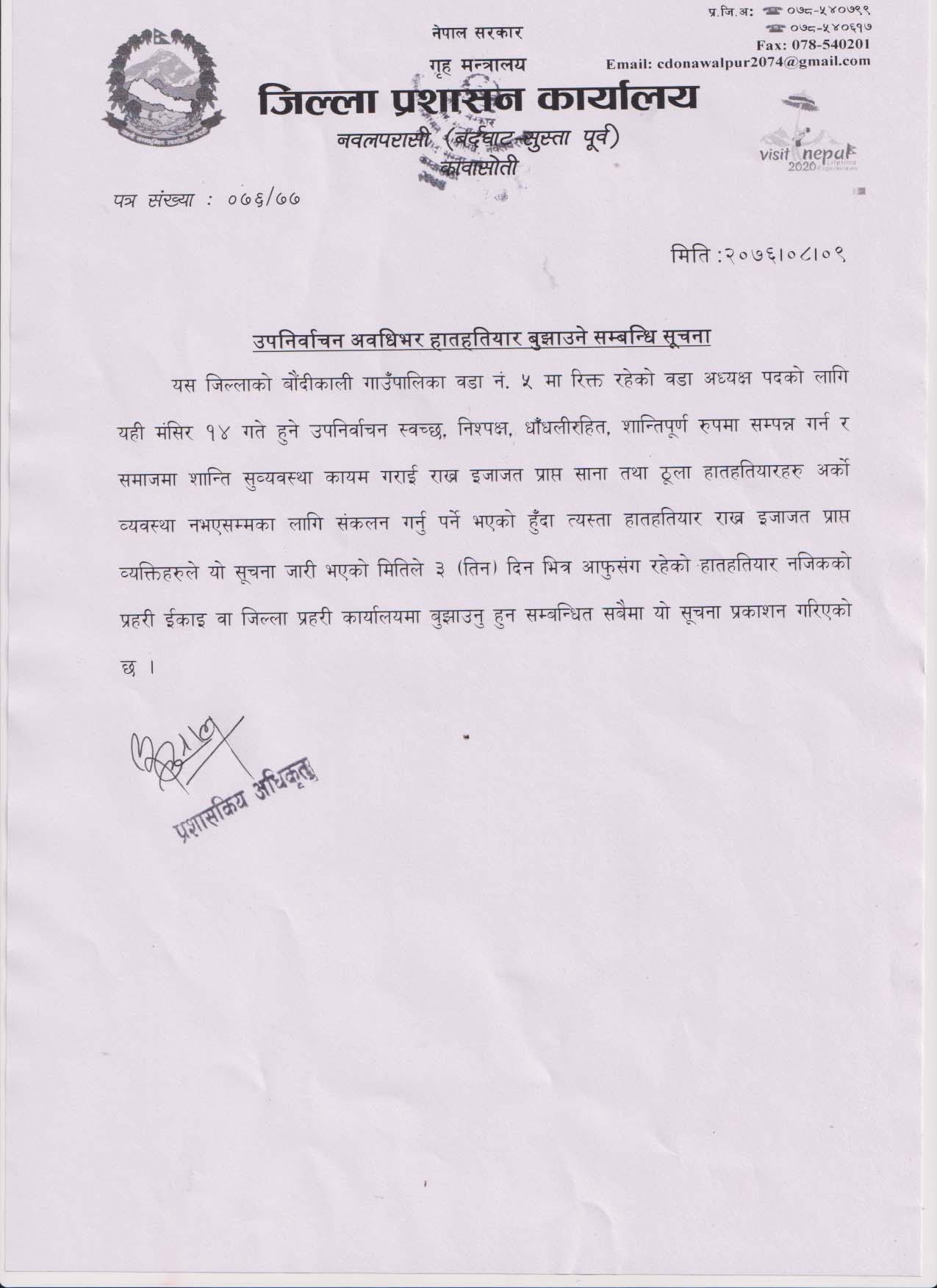 नवलपरासी(ब.सु.पू)का प्रमुख जिल्ला अधिकारी श्री पिताम्बर घिमिरेबाट जारी आदेश