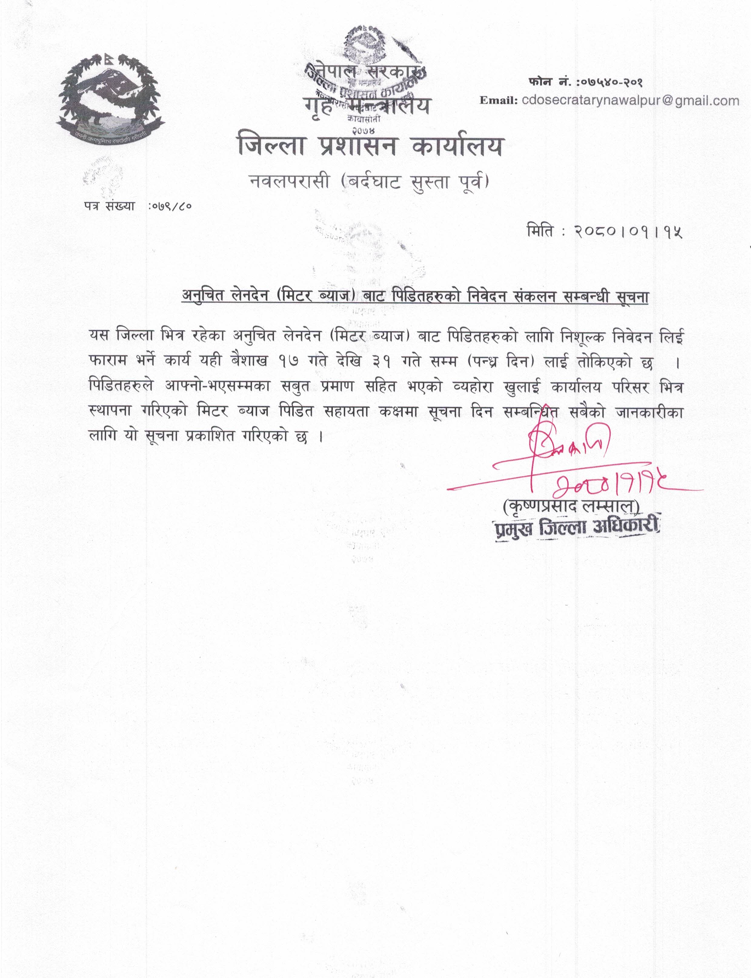 © सर्वाधिकार सुरक्षित जिल्ला प्रशासन कार्यालय, नवलपरासी (बर्दघाट सुस्ता पूर्व)