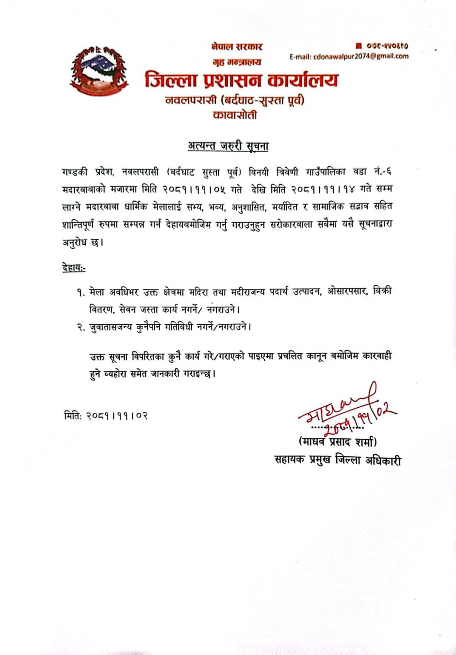 © सर्वाधिकार सुरक्षित जिल्ला प्रशासन कार्यालय, नवलपरासी (बर्दघाट सुस्ता पूर्व)