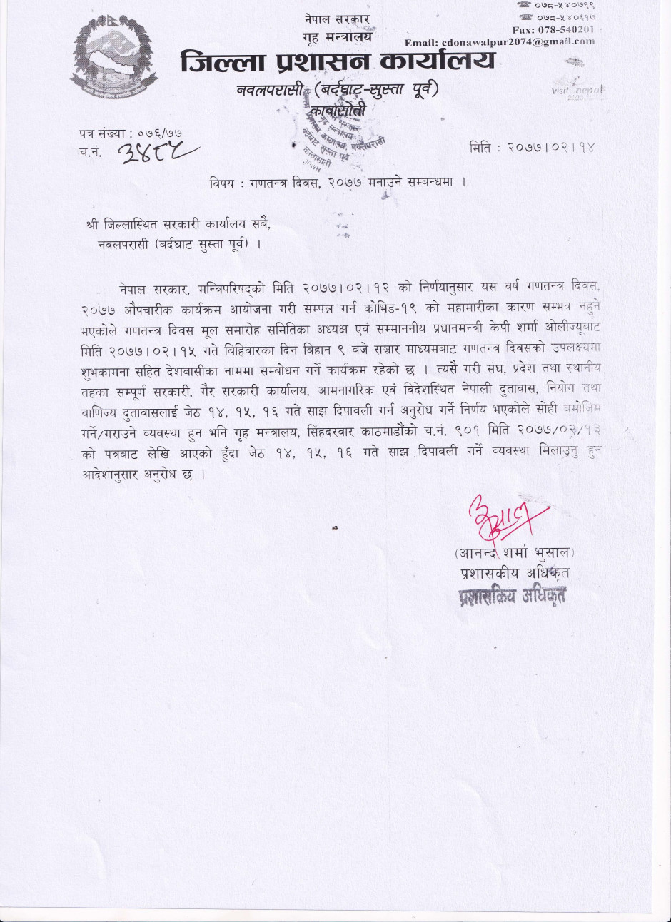 © सर्वाधिकार सुरक्षित जिल्ला प्रशासन कार्यालय, नवलपरासी (बर्दघाट सुस्ता पूर्व)