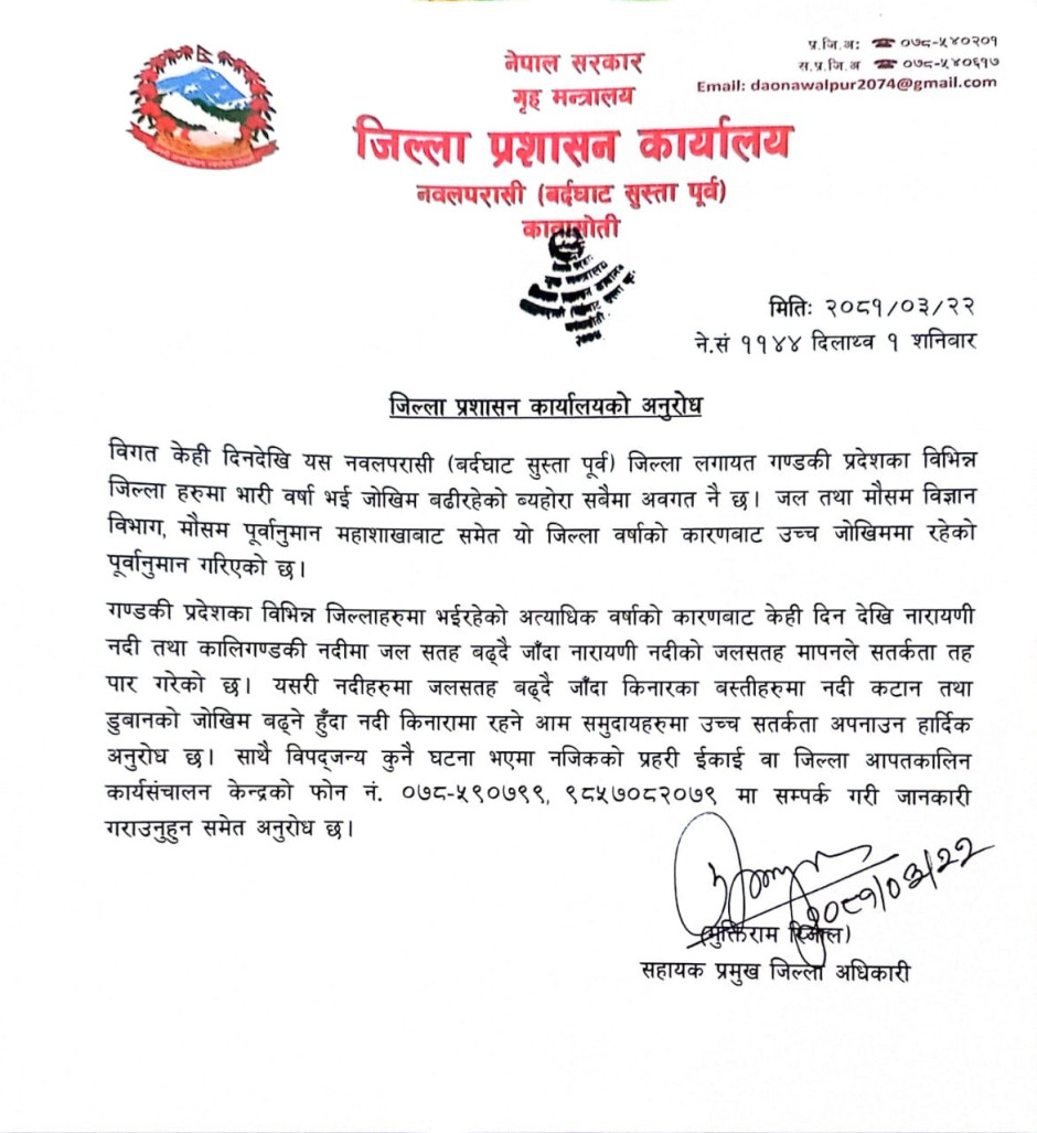 © सर्वाधिकार सुरक्षित जिल्ला प्रशासन कार्यालय, नवलपरासी (बर्दघाट सुस्ता पूर्व)