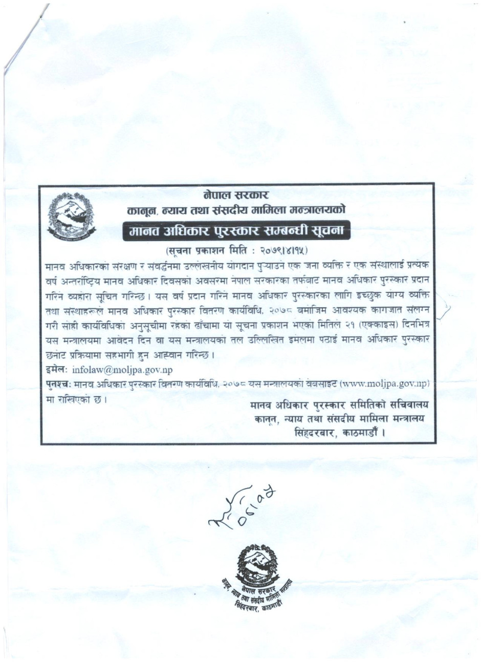 मानव अधिकार पूरस्कार सम्बन्धी सूचना