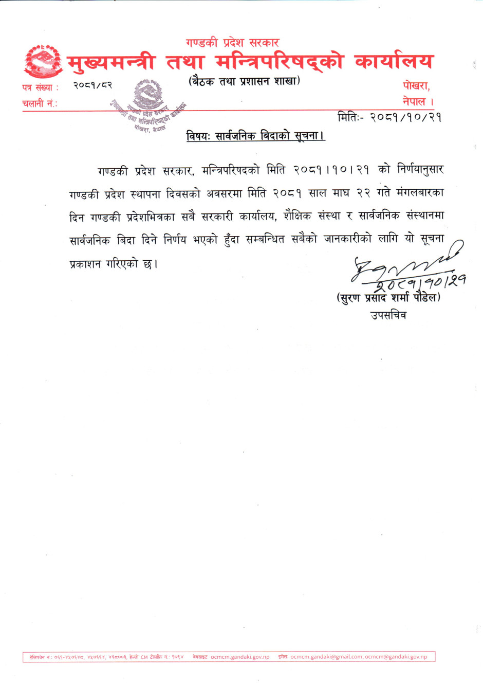 तस्बिर : मितिः२०८१/१०/२२ गते सार्वजनिक विदा सम्बन्धी सूचना।