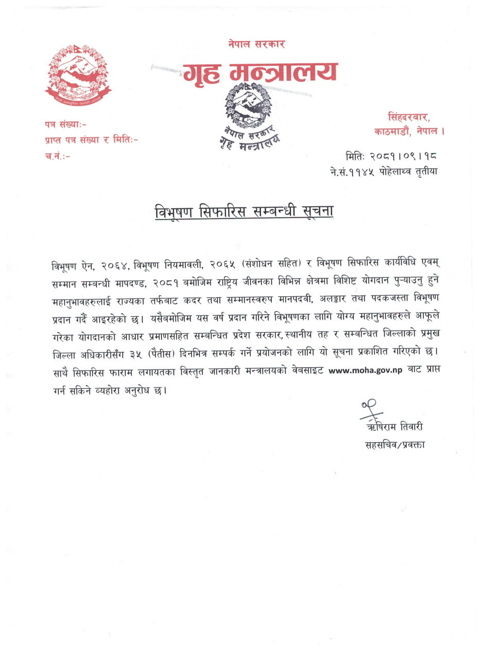 तस्बिर : नेपाल सरकार, गृह मन्त्रालय, सिंहदरवार, काठमाडौंको विभूषण सिफारिस गर्ने सम्बन्धी सूचना