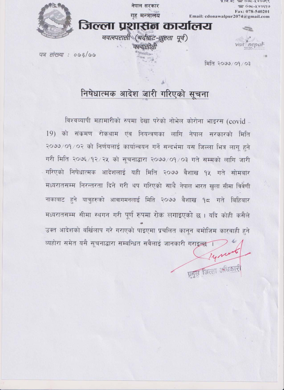 © सर्वाधिकार सुरक्षित जिल्ला प्रशासन कार्यालय, नवलपरासी (बर्दघाट सुस्ता पूर्व) .