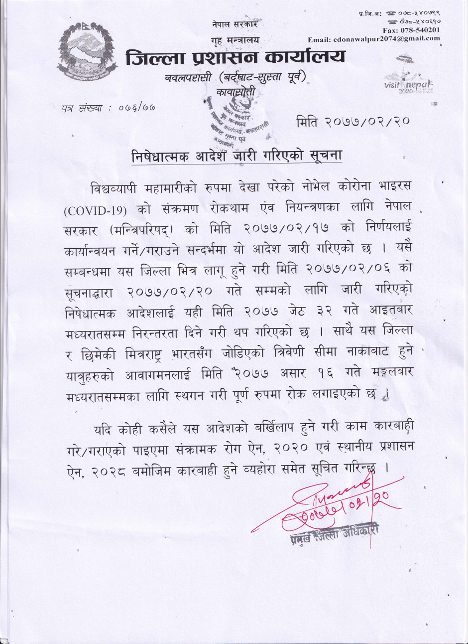 © सर्वाधिकार सुरक्षित जिल्ला प्रशासन कार्यालय, नवलपरासी (बर्दघाट सुस्ता पूर्व)