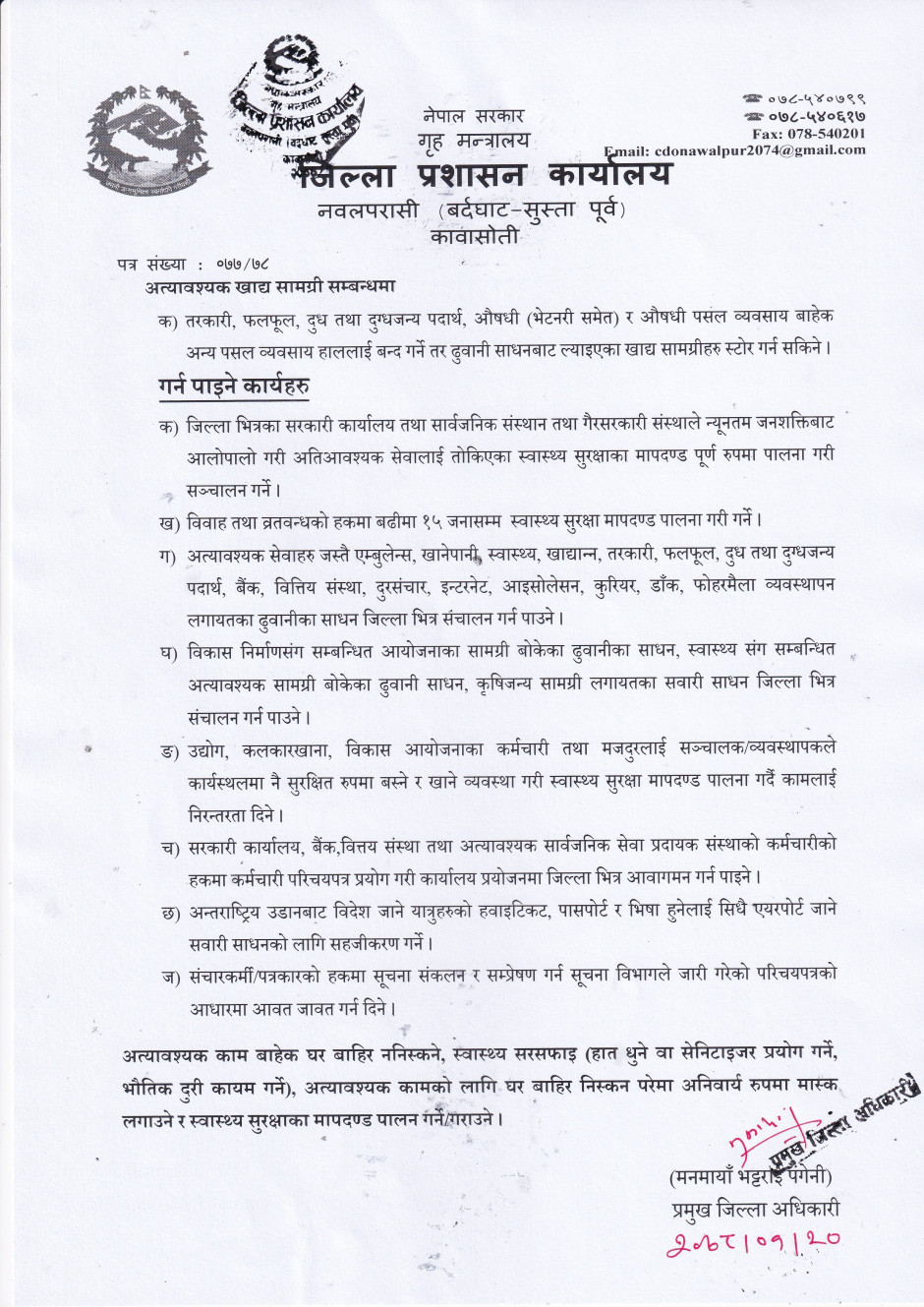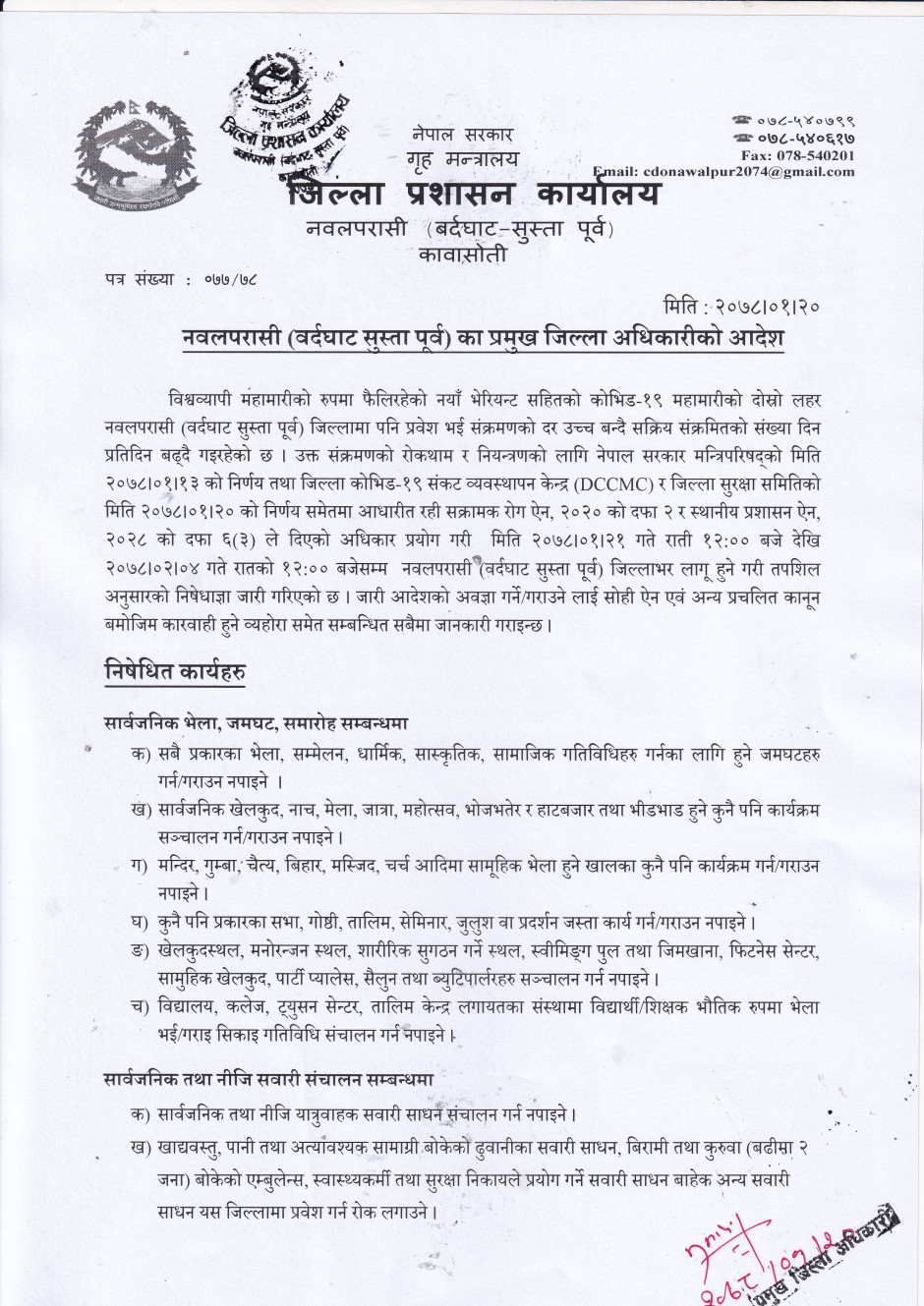नवलपरासी (वर्दघाट सुस्ता पूर्व) का प्रमुख जिल्ला अधिकारीको आदेश