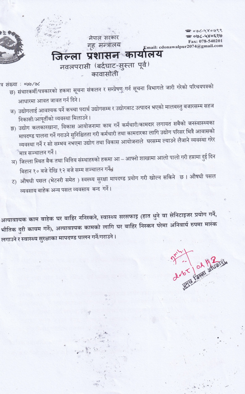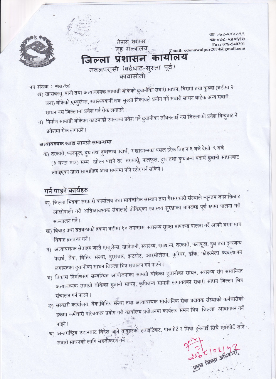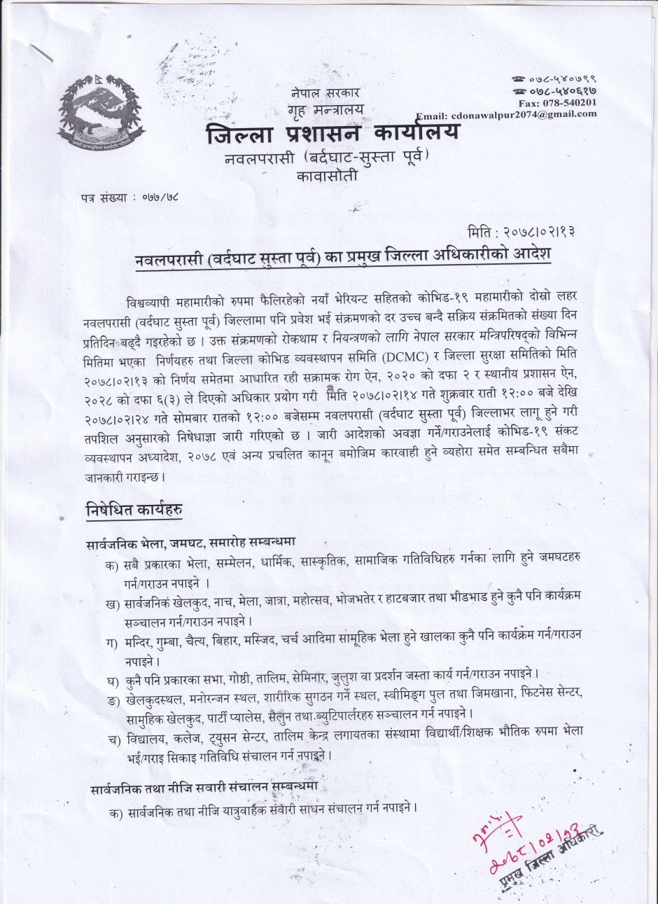 नवलपरासी (वर्दघाट सुस्ता पूर्व) का प्रमुख जिल्ला अधिकारीको आदेश