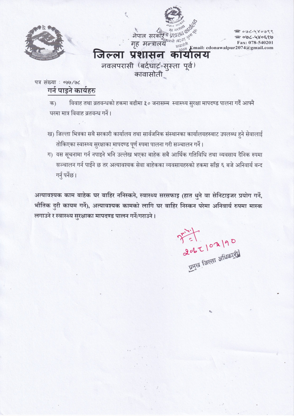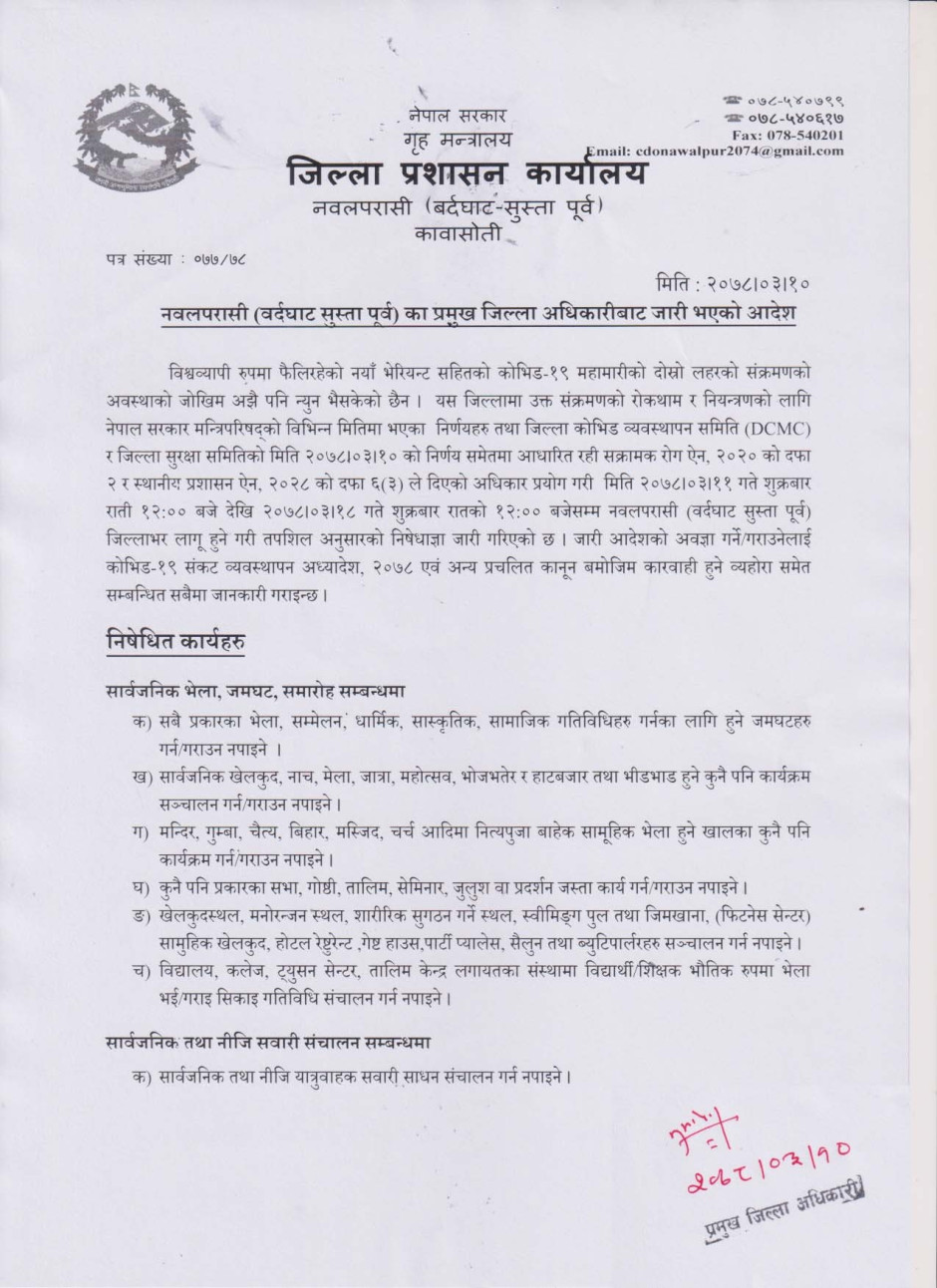नवलपरासी (वर्दघाट सुस्ता पूर्व) का प्रमुख जिल्ला अधिकारीको आदेश