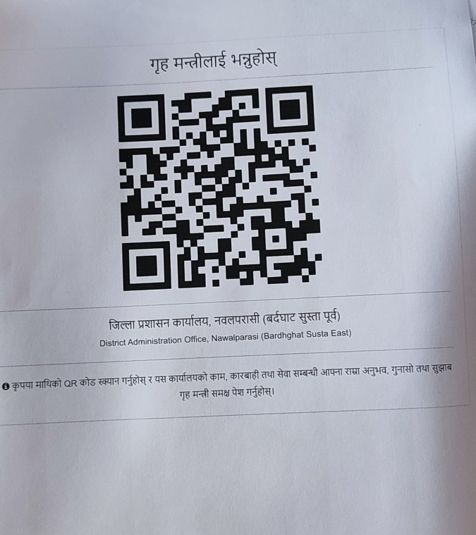 तस्बिर : QR कोड स्क्यान गरी यस कार्यालयको काम, कारबाही तथा सेवा सम्बन्धी आफ्ना राम्रा अनुभव, गुनासो तथा सुझाब गृह मन्त्री समक्ष पेश गर्ने सम्बन्धमा