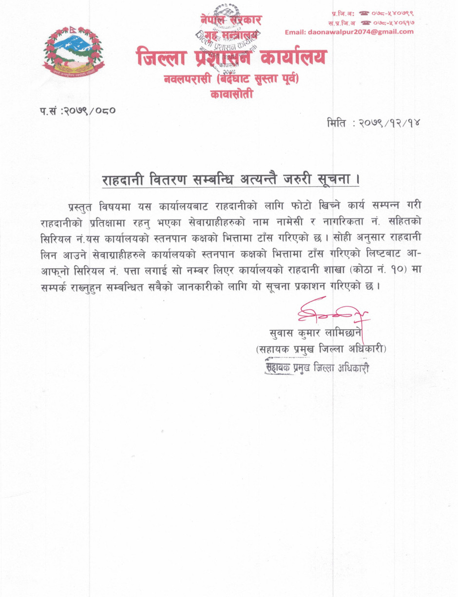 © सर्वाधिकार सुरक्षित जिल्ला प्रशासन कार्यालय, नवलपरासी (बर्दघाट सुस्ता पूर्व)