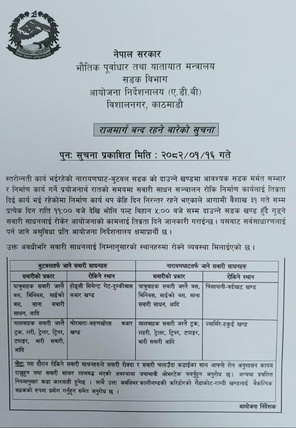 राजमार्ग बन्द रहने सम्बन्धी सुचना।