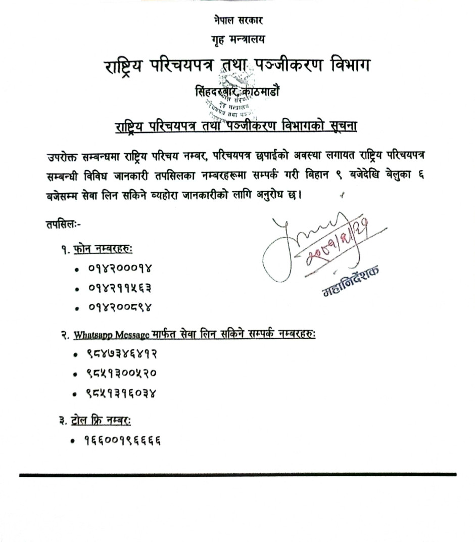 तस्बिर : राष्ट्रिय परिचयपत्र तथा पञ्जीकरण विभागको सूचना