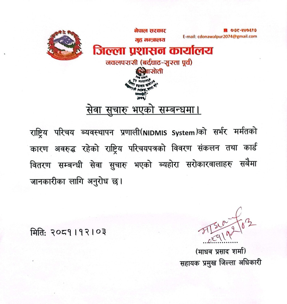 © सर्वाधिकार सुरक्षित जिल्ला प्रशासन कार्यालय, नवलपरासी (बर्दघाट सुस्ता पूर्व)