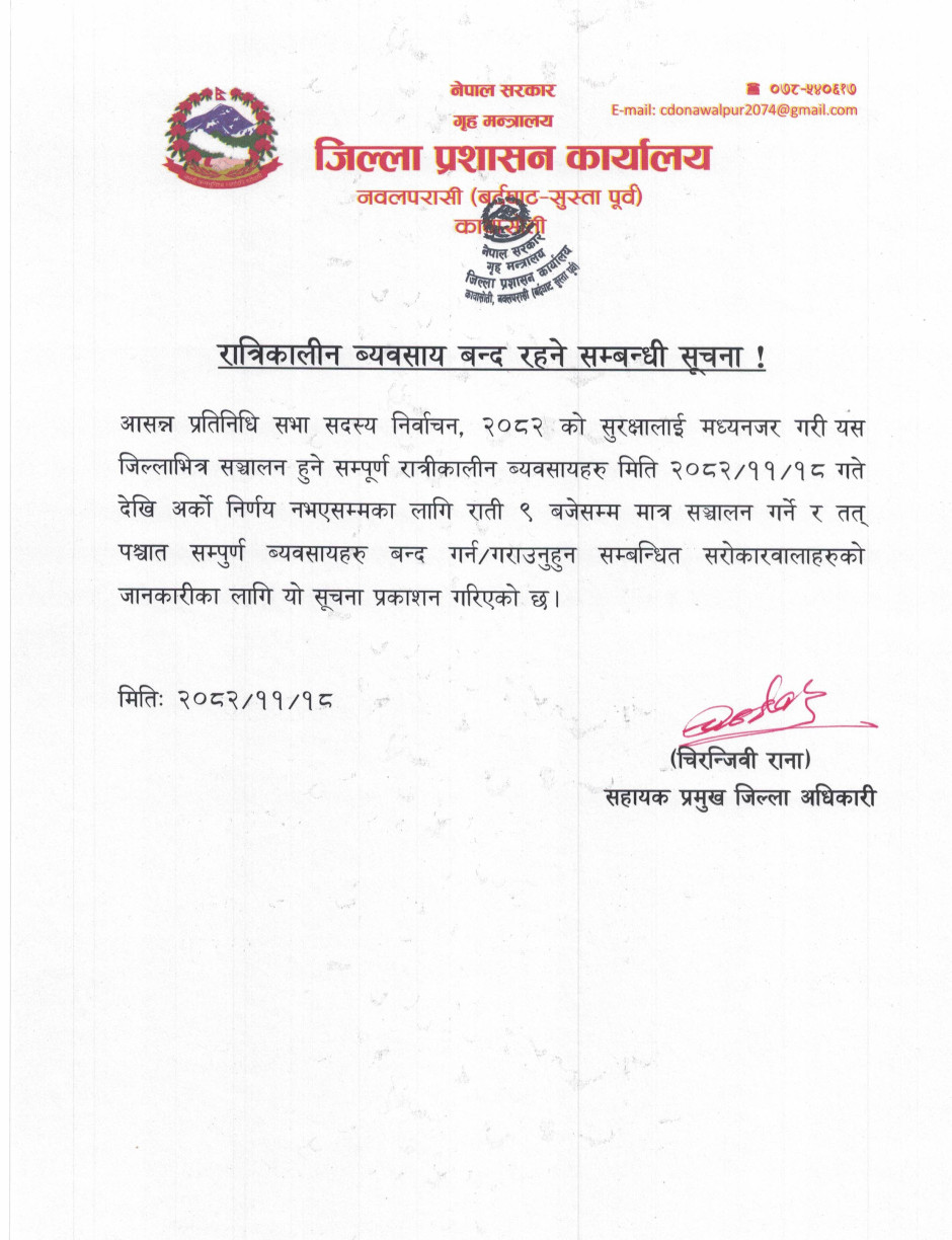 © सर्वाधिकार सुरक्षित जिल्ला प्रशासन कार्यालय, नवलपरासी (बर्दघाट सुस्ता पूर्व) .
