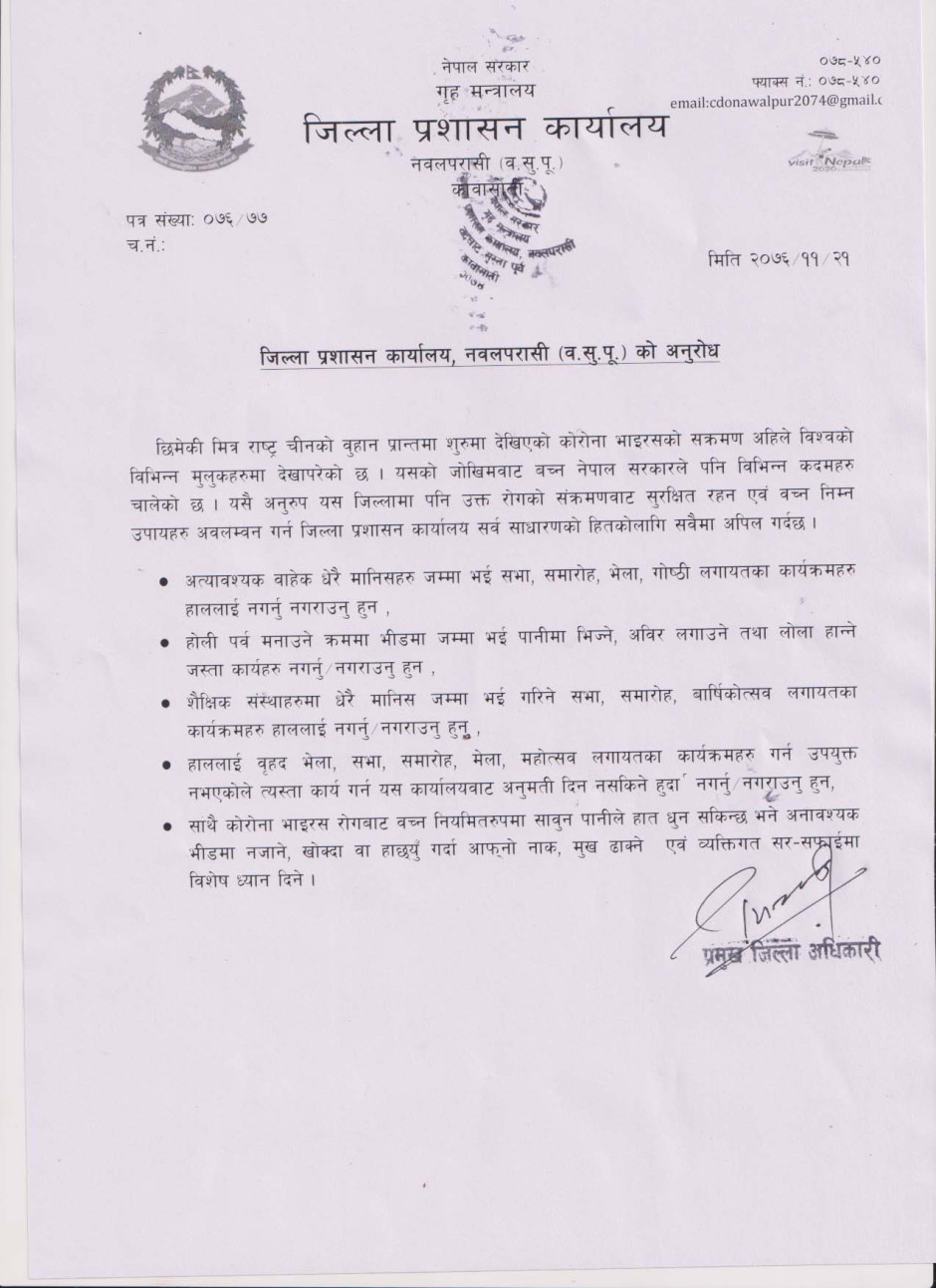 संभावित कोरोना भाइरस नियन्त्रण सम्बन्धि जिल्ला प्रशासन कार्यालयको अनुरोध