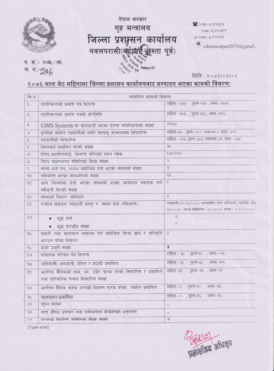 २०७६ साल जेठ महिनामा जिल्ला प्रशासन कार्यालयबाट सम्पादन भएको कामको विवरण