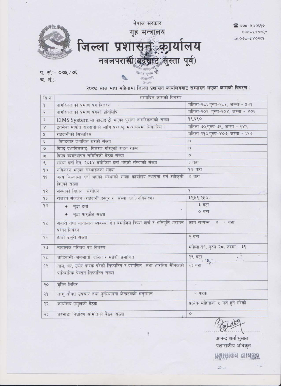 २०७५ साल माघ महिनामा जिल्ला प्रशासन कार्यालयबाट सम्पादन भएको कामको विवरण