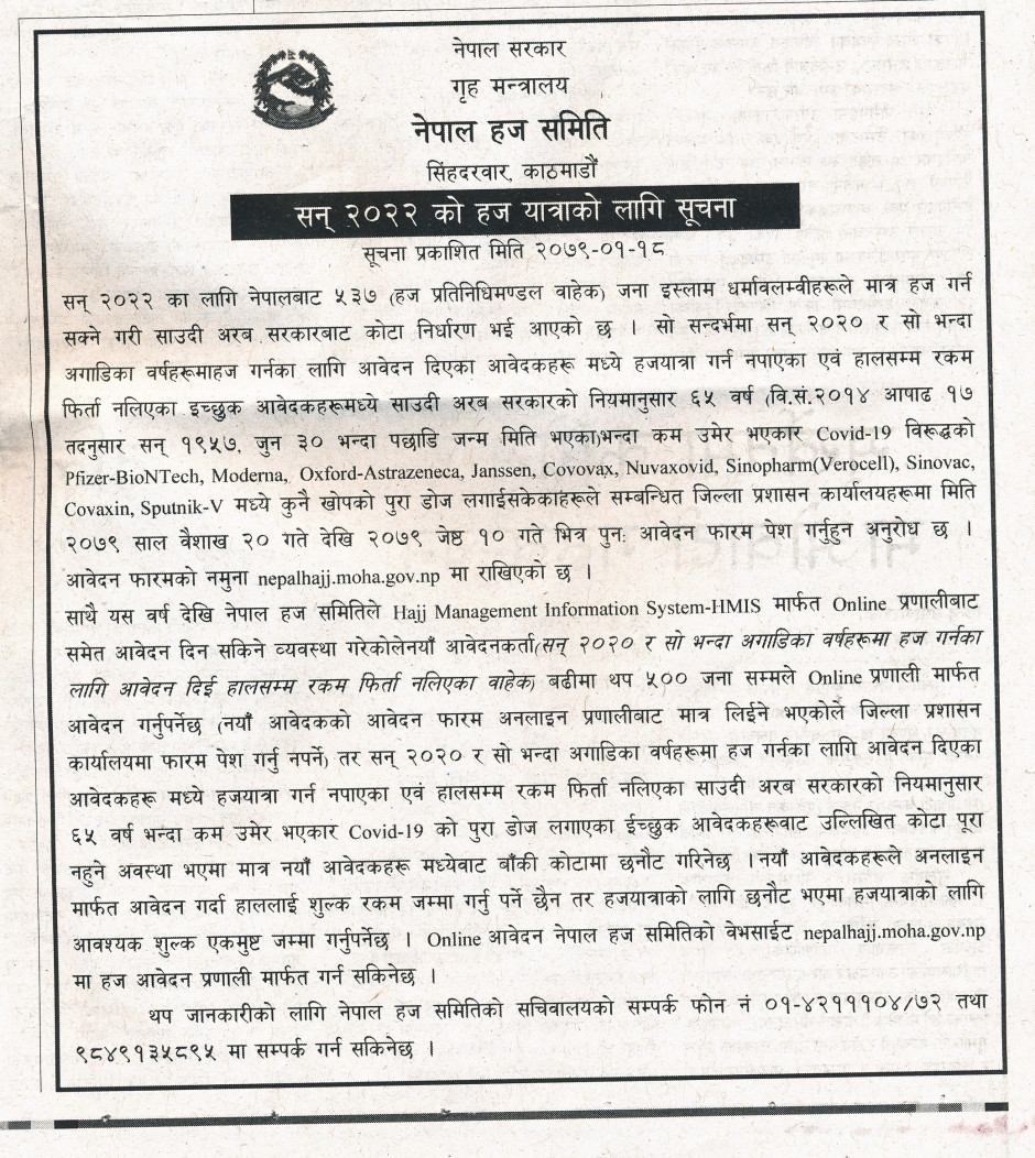 सन् २०२२ को हज यात्रा सम्बन्धी अत्यन्त जरुरी सूचना
