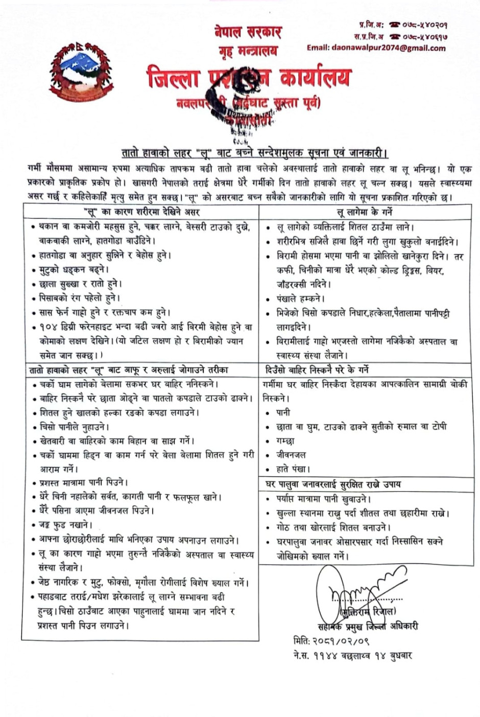 तस्बिर : तातो हावाको लहर "लू" बाट बच्ने सन्देशमुलक सूचना एवं जानकारी।