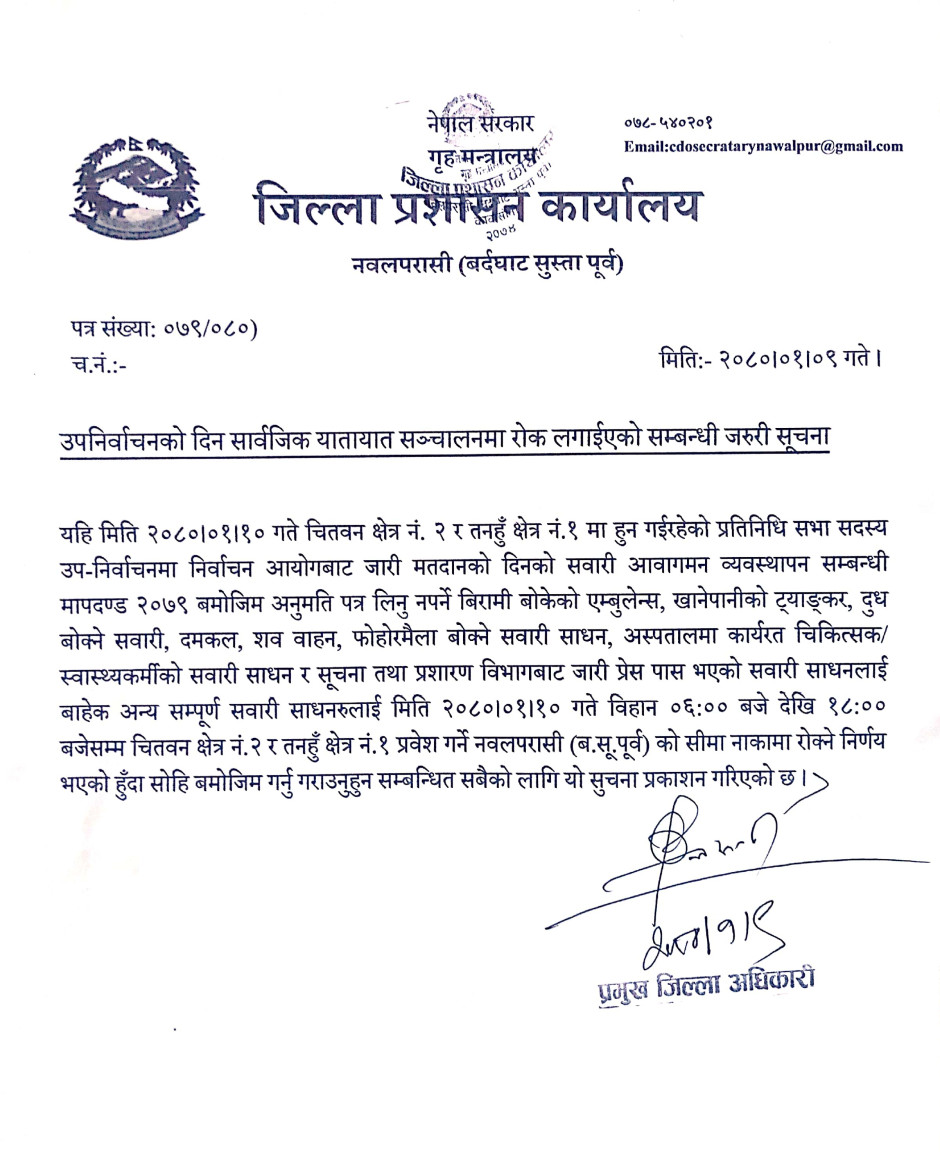 © सर्वाधिकार सुरक्षित जिल्ला प्रशासन कार्यालय, नवलपरासी (बर्दघाट सुस्ता पूर्व) .