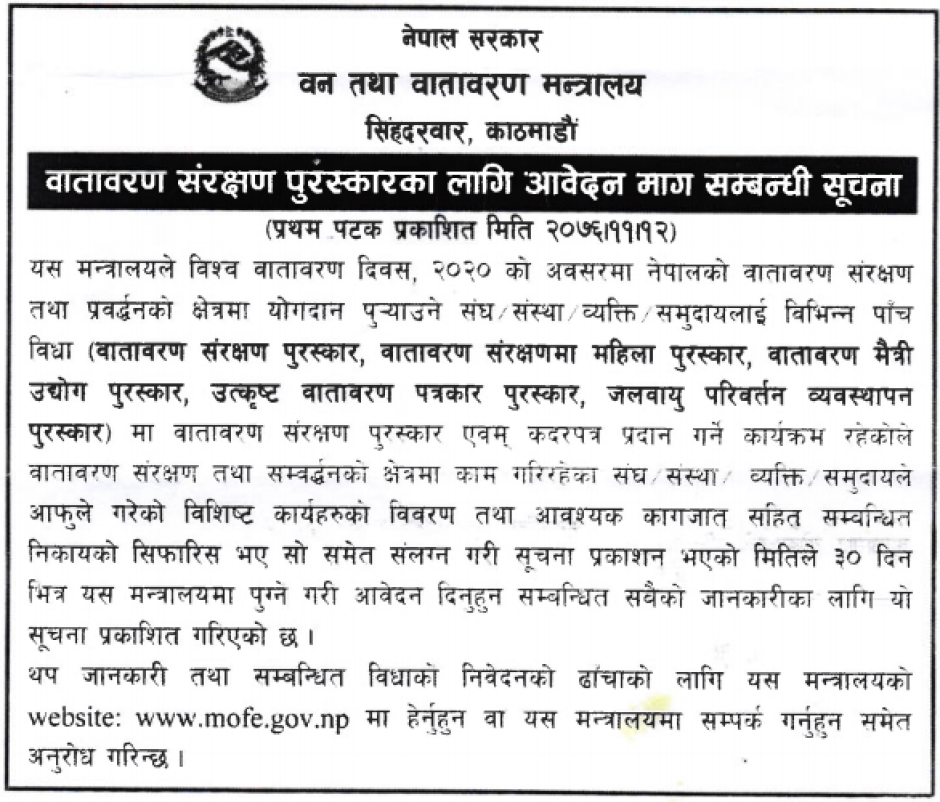 वातावरण संरक्षण पुरस्कारका लागि आवेदन माग सम्बन्धी वन मन्त्रालयको सूचना